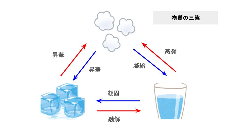 - 物質は 固体・液体・気体の三態 で存在する。