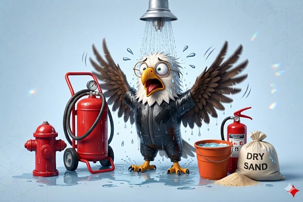 自動消火設備は 火災発生時に熱・炎・煙を検知して、消火剤(多くは水や泡)を放出するしくみ なんだ。