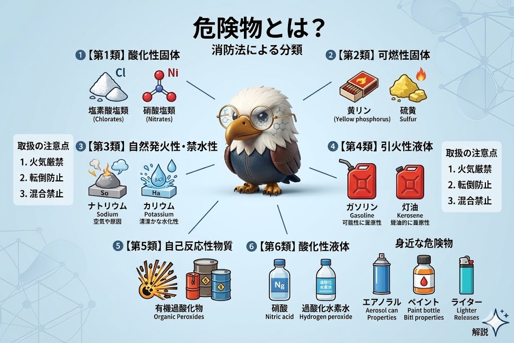 • 📌 消防法では危険物を 化学的・物理的性質によって大きく6つの区分 に分けている(例:引火性液体、酸化性物質、可燃性固体など)。