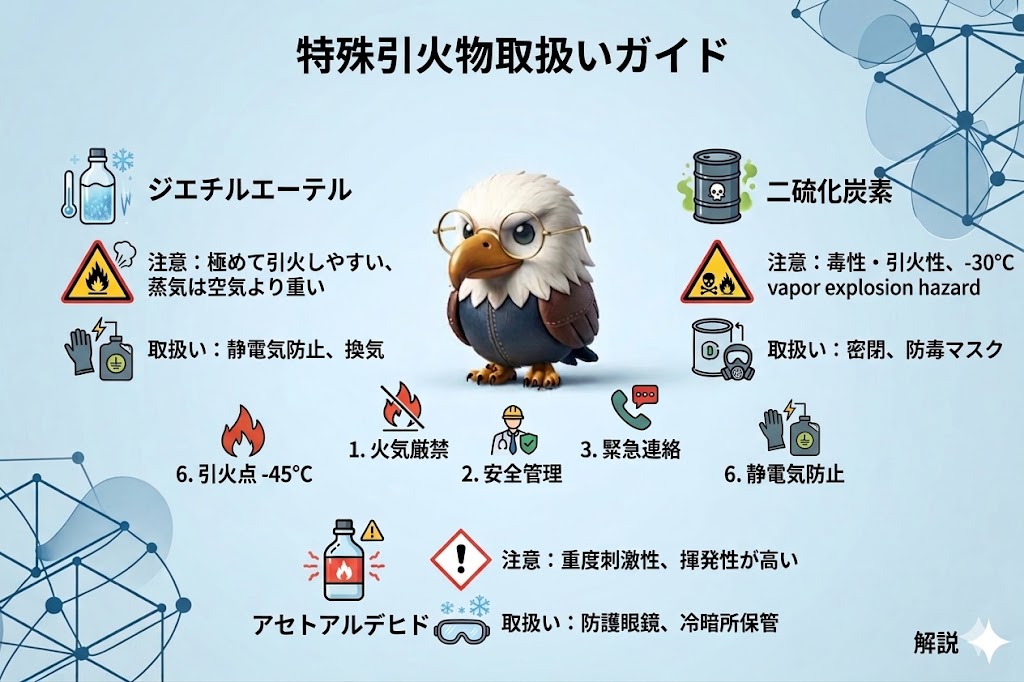 - 🧪 代表例:ジエチルエーテル、二硫化炭素、アセトアルデヒド、酸化プロピレン など(常温でも蒸気が発生しやすい)。