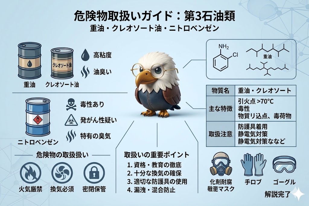 • 🧪 代表例:重油・クレオソート油・アニリン・ニトロベンゼン・グリセリン・エチレングリコール など。