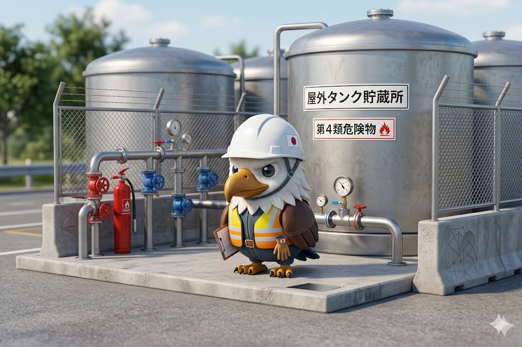 屋外タンク貯蔵所は、屋外に設置したタンクで危険物を貯蔵する施設のことだよ。火災や漏洩・爆発の危険性が高いから、位置・構造・設備・空地などに細かい基準が法令で決められているんだ。