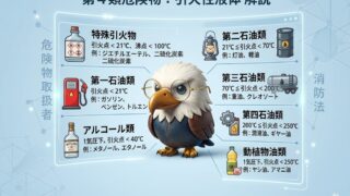 学習 乙4ブログ 第5章 危険物の性質 ②第4類危険物 ②第4類危険物📌 はじめに引火性液体の性質と基礎ポイント危険物取扱者乙種第4類の学習でまず押さえたいのが、「第4類危険物」の性質です。この分類は 身近な液体(ガソリン・灯油・アルコールなど)がなぜ危険なのか を理解する入り口になり、試験でも... 2025.04.25 学習第5章 危険物の性質